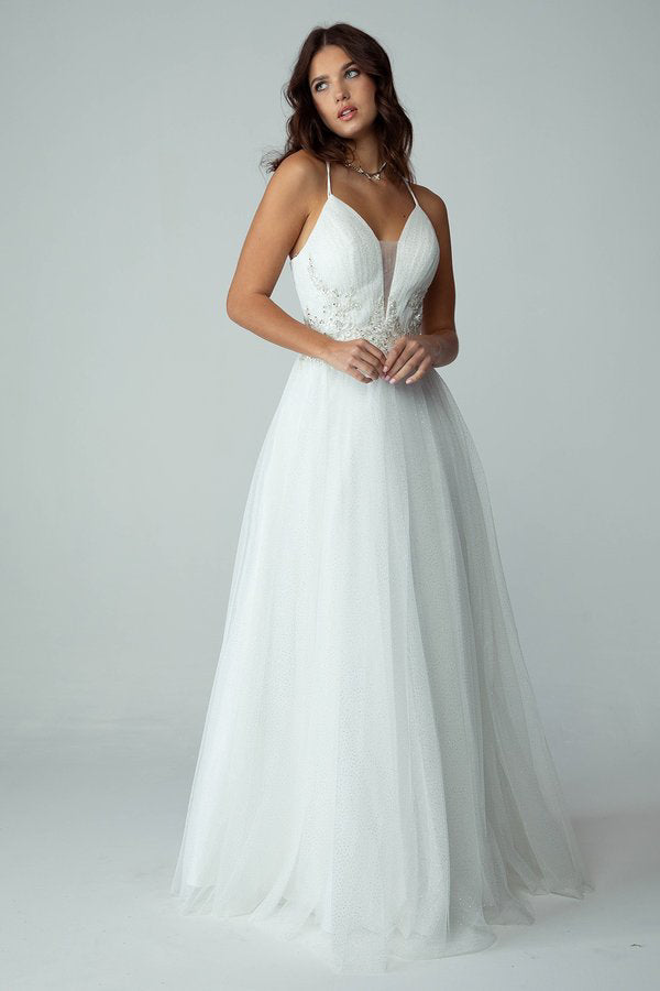 Flowy A-line (princess-like) with a full-length skirt that flares out gracefully, often finishing in a sweep train for added drama. Deep V-neck or illusion deep V-neck with a sheer inset for a touch of allure. Sleeveless with double spaghetti straps or double rouleau straps (thin, supportive straps). Features beautiful floral embroidery, appliques, and beaded accents concentrated at the center waist and bodice for a sparkling, eye-catching effect. Some versions have a ruched or corset-style bodice. Open crisscross/lace-up design (corset back or tie closure) for adjustable fit and a sexy, customizable look; often combined with a zipper for security.
